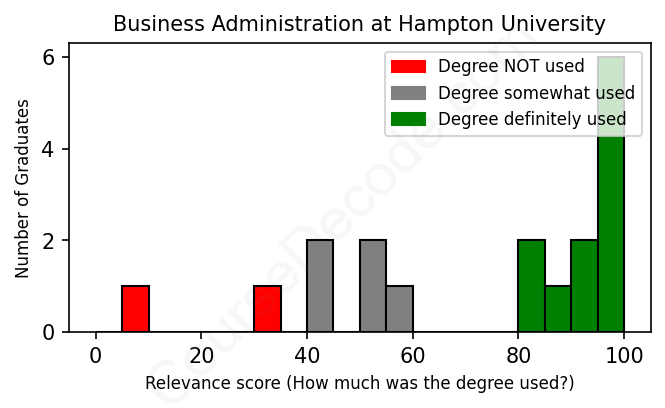 The verdict? Slightly above average. Overall, with an average relevance score of 72%, Business Administration graduates from Hampton University have a slightly higher likelihood (+5%) of finding work in this field compared to the average graduate across all fields: