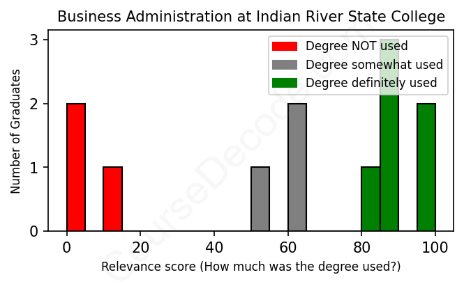The verdict? Below average. Overall, with an average relevance score of 60%, Business Administration graduates from Indian River State College have a lower likelihood (-7%) of finding work in this field compared to the average graduate across all fields: