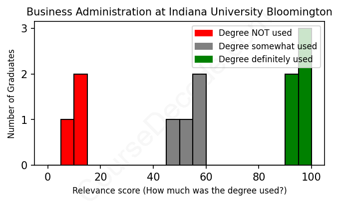 The verdict? Below average. Overall, with an average relevance score of 60%, Business Administration graduates from Indiana University Bloomington have a lower likelihood (-7%) of finding work in this field compared to the average graduate across all fields: