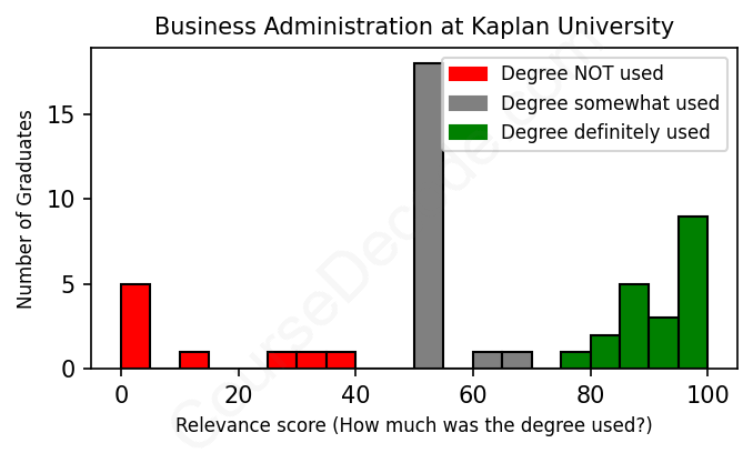 The verdict? Below average. Overall, with an average relevance score of 61%, Business Administration graduates from Kaplan University have a lower likelihood (-6%) of finding work in this field compared to the average graduate across all fields: