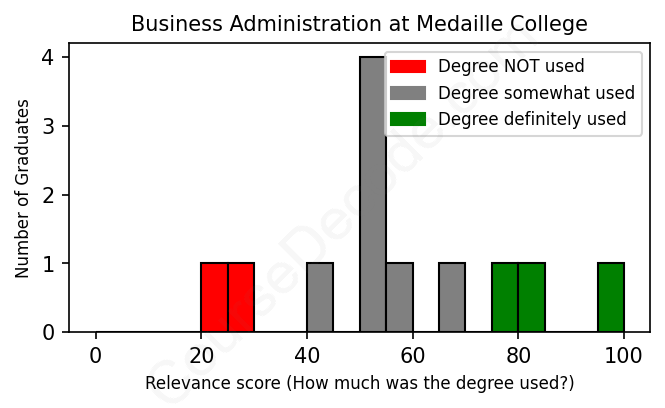 The verdict? Significantly below average. Overall, with an average relevance score of 56%, Business Administration graduates from Medaille College have a much lower likelihood (-11%) of finding work in this field compared to the average graduate across all fields: