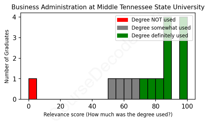 The verdict? Above average. Overall, with an average relevance score of 75%, Business Administration graduates from Middle Tennessee State University have a higher likelihood (+8%) of finding work in this field compared to the average graduate across all fields:
