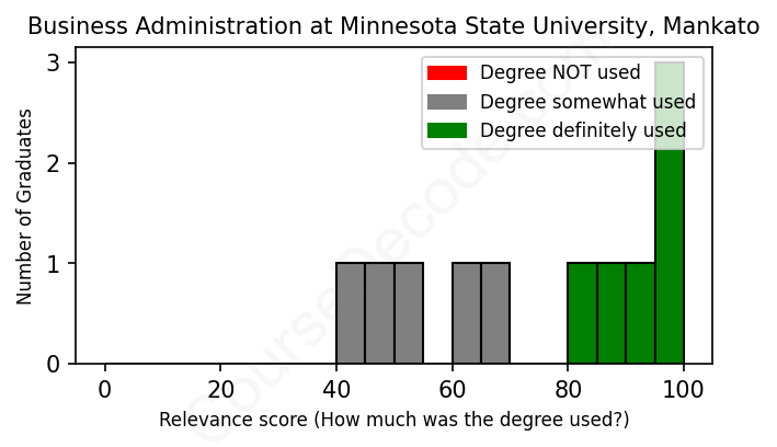 The verdict? Above average. Overall, with an average relevance score of 74%, Business Administration graduates from Minnesota State University, Mankato have a higher likelihood (+7%) of finding work in this field compared to the average graduate across all fields: