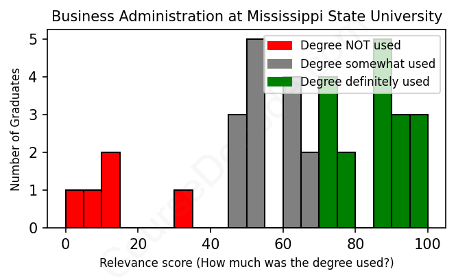 The verdict? Slightly below average. Overall, with an average relevance score of 63%, Business Administration graduates from Mississippi State University have a slightly lower likelihood (-4%) of finding work in this field compared to the average graduate across all fields: