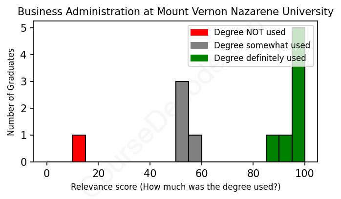 The verdict? Above average. Overall, with an average relevance score of 75%, Business Administration graduates from Mount Vernon Nazarene University have a higher likelihood (+8%) of finding work in this field compared to the average graduate across all fields: