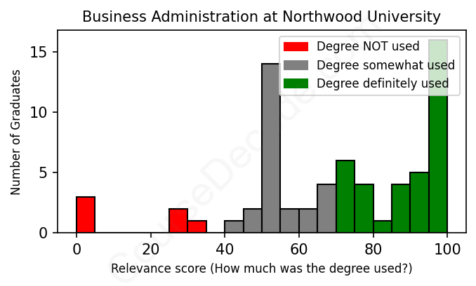 The verdict? Slightly above average. Overall, with an average relevance score of 69%, Business Administration graduates from Northwood University have a slightly higher likelihood (+2%) of finding work in this field compared to the average graduate across all fields: