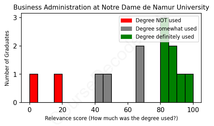 The verdict? Slightly below average. Overall, with an average relevance score of 65%, Business Administration graduates from Notre Dame de Namur University have a slightly lower likelihood (-2%) of finding work in this field compared to the average graduate across all fields: