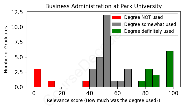 The verdict? Below average. Overall, with an average relevance score of 57%, Business Administration graduates from Park University have a lower likelihood (-10%) of finding work in this field compared to the average graduate across all fields: