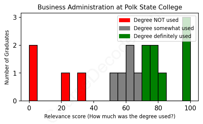 The verdict? Below average. Overall, with an average relevance score of 61%, Business Administration graduates from Polk State College have a lower likelihood (-6%) of finding work in this field compared to the average graduate across all fields: