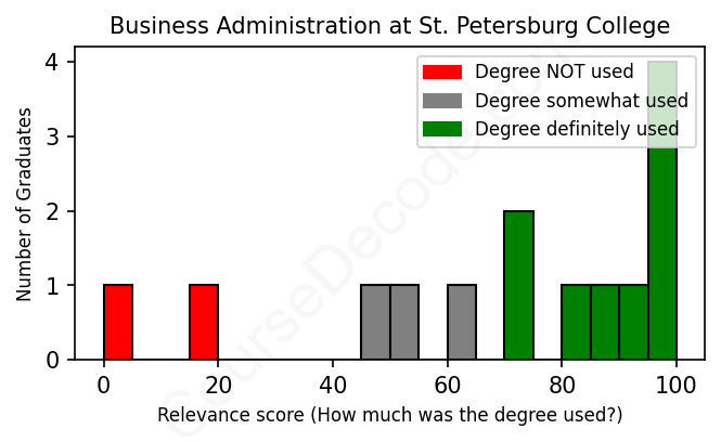 The verdict? Slightly above average. Overall, with an average relevance score of 69%, Business Administration graduates from St. Petersburg College have a slightly higher likelihood (+2%) of finding work in this field compared to the average graduate across all fields: