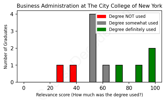 The verdict? Slightly below average. Overall, with an average relevance score of 62%, Business Administration graduates from The City College of New York have a slightly lower likelihood (-5%) of finding work in this field compared to the average graduate across all fields: