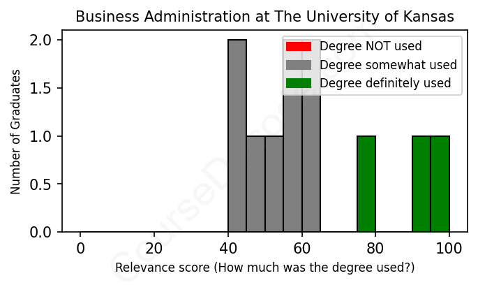 The verdict? Slightly below average. Overall, with an average relevance score of 62%, Business Administration graduates from The University of Kansas have a slightly lower likelihood (-5%) of finding work in this field compared to the average graduate across all fields: