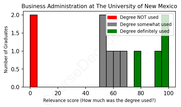 The verdict? Below average. Overall, with an average relevance score of 59%, Business Administration graduates from The University of New Mexico have a lower likelihood (-8%) of finding work in this field compared to the average graduate across all fields: