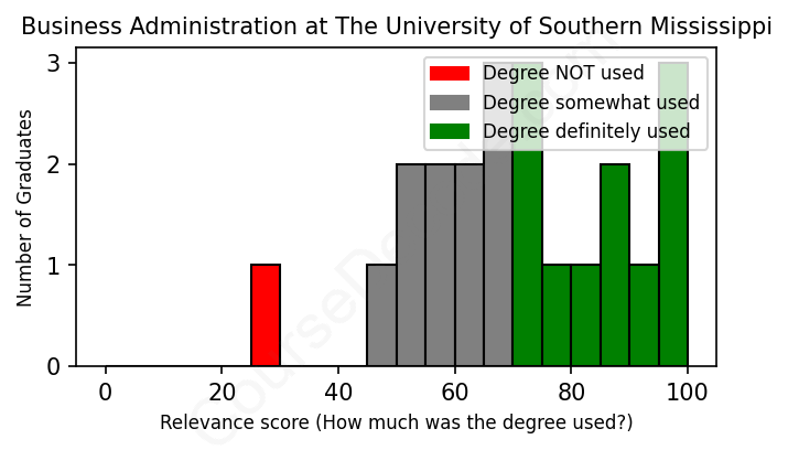 The verdict? Slightly above average. Overall, with an average relevance score of 70%, Business Administration graduates from The University of Southern Mississippi have a slightly higher likelihood (+3%) of finding work in this field compared to the average graduate across all fields:
