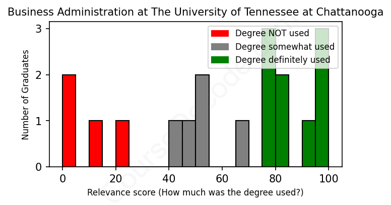 The verdict? Below average. Overall, with an average relevance score of 59%, Business Administration graduates from The University of Tennessee at Chattanooga have a lower likelihood (-8%) of finding work in this field compared to the average graduate across all fields: