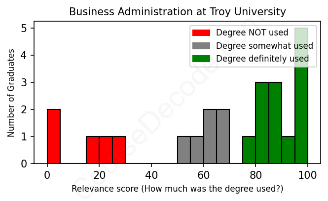 First, some facts. Of the Business Administration graduates from Troy University we've analyzed , here's how many have used (or NOT used) their degree in their career: