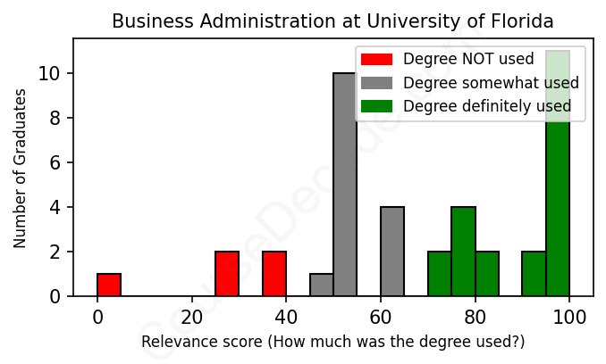 First, some facts. Of the Business Administration graduates from University of Florida we've analyzed , here's how many have used (or NOT used) their degree in their career: