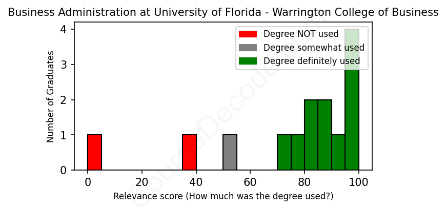 First, some facts. Of the Business Administration graduates from University of Florida - Warrington College of Business we've analyzed , here's how many have used (or NOT used) their degree in their career: