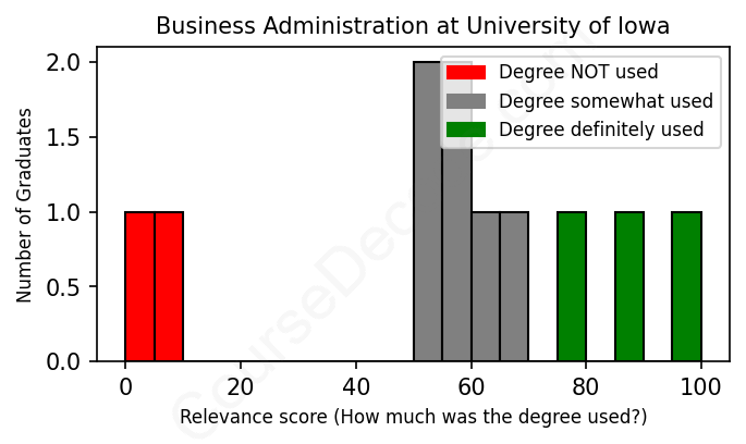 The verdict? Significantly below average. Overall, with an average relevance score of 55%, Business Administration graduates from University of Iowa have a much lower likelihood (-12%) of finding work in this field compared to the average graduate across all fields: