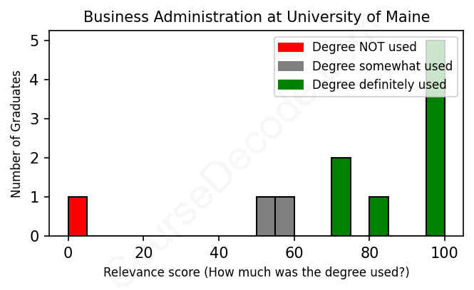 The verdict? Above average. Overall, with an average relevance score of 75%, Business Administration graduates from University of Maine have a higher likelihood (+8%) of finding work in this field compared to the average graduate across all fields: