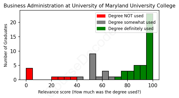 The verdict? Above average. Overall, with an average relevance score of 73%, Business Administration graduates from University of Maryland University College have a higher likelihood (+6%) of finding work in this field compared to the average graduate across all fields: