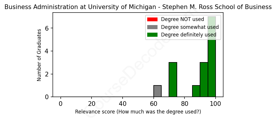 First, some facts. Of the Business Administration graduates from University of Michigan - Stephen M. Ross School of Business we've analyzed , here's how many have used (or NOT used) their degree in their career: