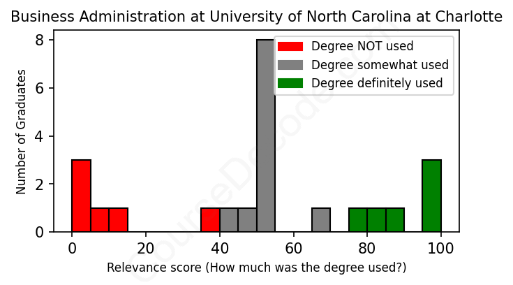 First, some facts. Of the Business Administration graduates from University of North Carolina at Charlotte we've analyzed , here's how many have used (or NOT used) their degree in their career: