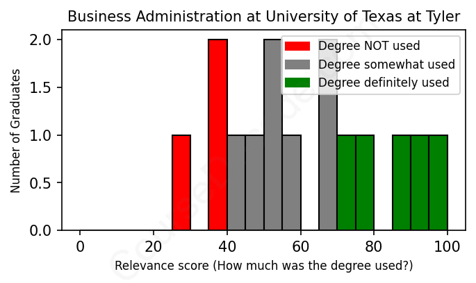 The verdict? Below average. Overall, with an average relevance score of 61%, Business Administration graduates from University of Texas at Tyler have a lower likelihood (-6%) of finding work in this field compared to the average graduate across all fields: