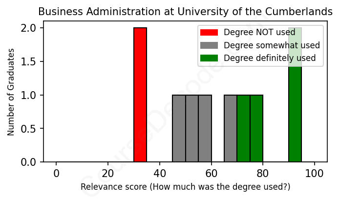 The verdict? Below average. Overall, with an average relevance score of 61%, Business Administration graduates from University of the Cumberlands have a lower likelihood (-6%) of finding work in this field compared to the average graduate across all fields:
