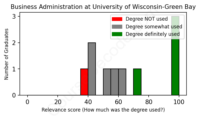 The verdict? Slightly below average. Overall, with an average relevance score of 66%, Business Administration graduates from University of Wisconsin-Green Bay have a slightly lower likelihood (-1%) of finding work in this field compared to the average graduate across all fields:
