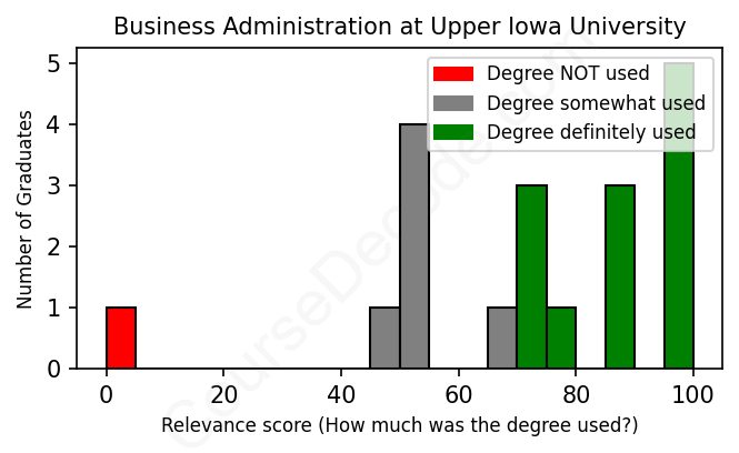 The verdict? Slightly above average. Overall, with an average relevance score of 71%, Business Administration graduates from Upper Iowa University have a slightly higher likelihood (+4%) of finding work in this field compared to the average graduate across all fields: