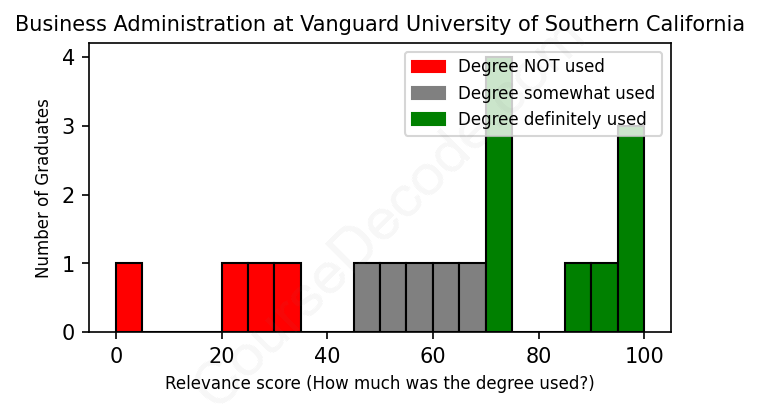 First, some facts. Of the Business Administration graduates from Vanguard University of Southern California we've analyzed , here's how many have used (or NOT used) their degree in their career: