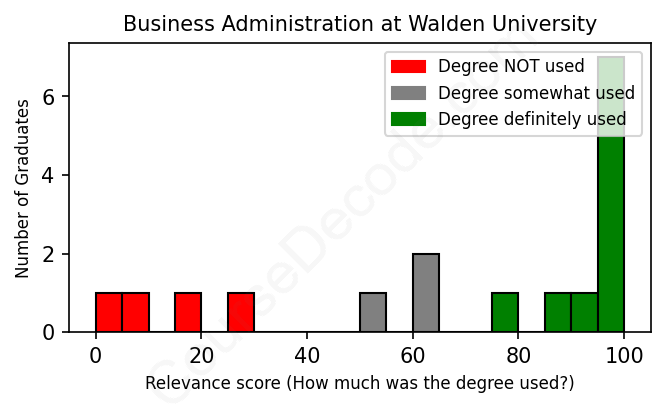 The verdict? Slightly above average. Overall, with an average relevance score of 69%, Business Administration graduates from Walden University have a slightly higher likelihood (+2%) of finding work in this field compared to the average graduate across all fields: