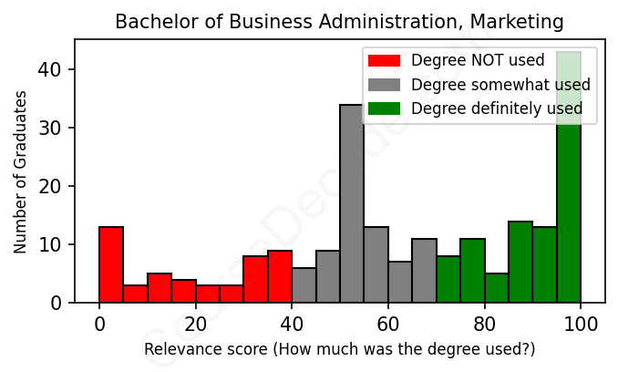 The verdict? Below average. Overall, with an average relevance score of 59%, Business Administration, Marketing graduates have a lower likelihood (-8%) of finding work in this field compared to the average graduate across all fields: