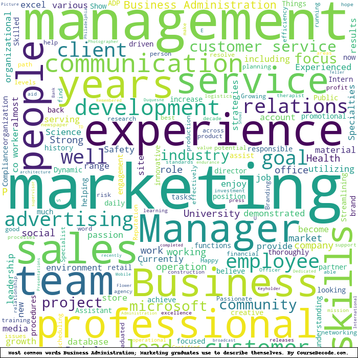 Here is a visual representation of the most common words seen in the "about" section of LinkedIn profiles who have a Bachelor degree in Business Administration, Marketing. This may or may not be useful: