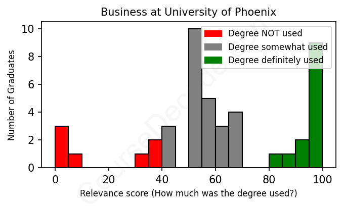 The verdict? Below average. Overall, with an average relevance score of 61%, Business graduates from University of Phoenix have a lower likelihood (-6%) of finding work in this field compared to the average graduate across all fields:
