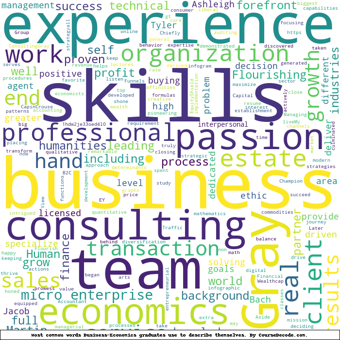 Here is a visual representation of the most common words seen in the "about" section of LinkedIn profiles who have a Bachelor degree in Business Economics. This may or may not be useful:
