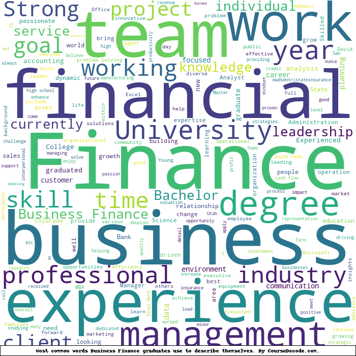 Here is a visual representation of the most common words seen in the "about" section of LinkedIn profiles who have a Bachelor degree in Business Finance. This may or may not be useful: