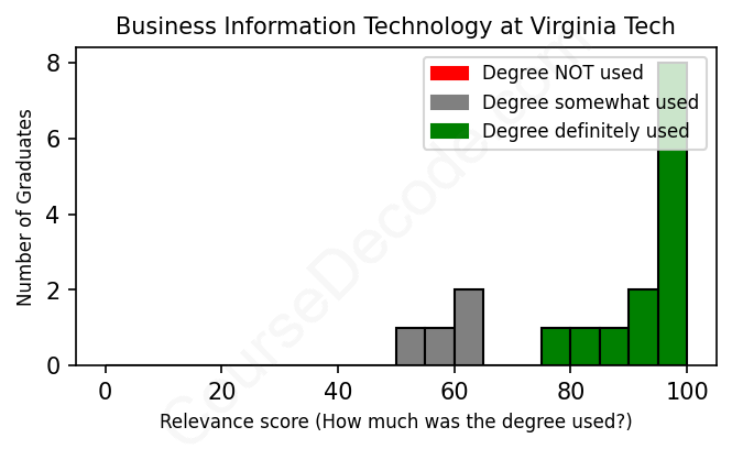 The verdict? Significantly above average. Overall, with an average relevance score of 85%, Business Information Technology graduates from Virginia Tech have a much higher likelihood (+18%) of finding work in this field compared to the average graduate across all fields: