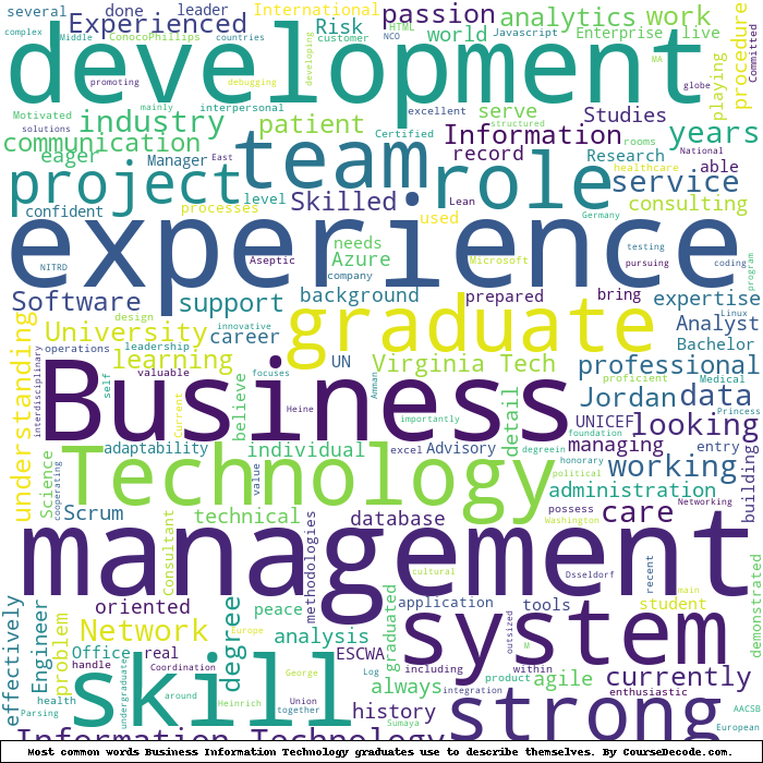 Here is a visual representation of the most common words seen in the "about" section of LinkedIn profiles who have a Bachelor degree in Business Information Technology (this is across all Business Information Technology graduates we've analyzed, not just those who went to Virginia Tech). This may or may not be useful: