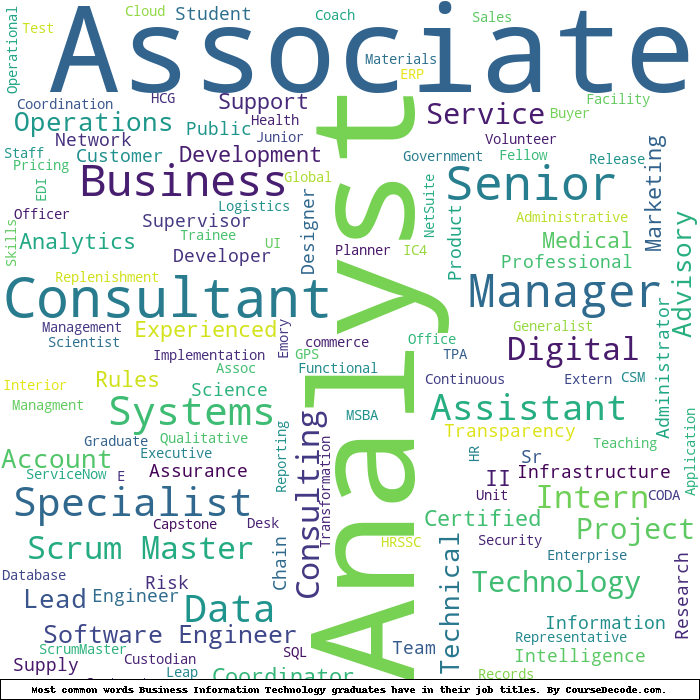 Here is a visual representation of the most common words in job titles for Business Information Technology graduates (this is across all Business Information Technology graduates we've analyzed, not just those who went to Virginia Tech):