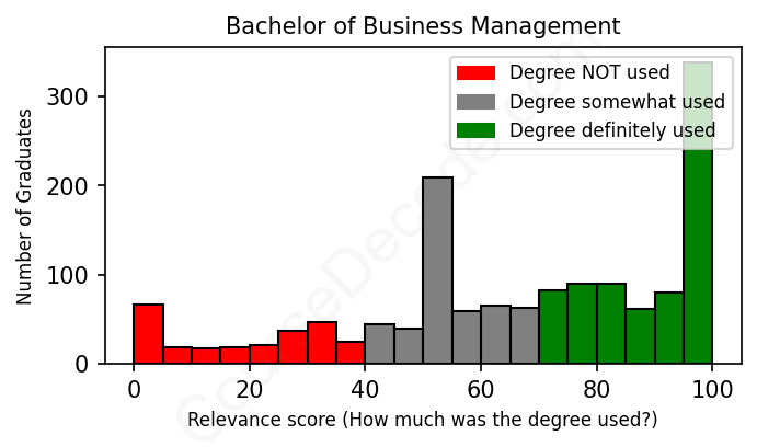 The verdict? Slightly below average. Overall, with an average relevance score of 66%, Business Management graduates have a slightly lower likelihood (-1%) of finding work in this field compared to the average graduate across all fields: