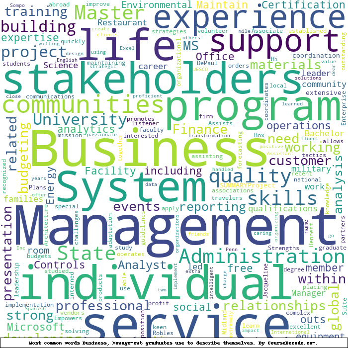 Here is a visual representation of the most common words seen in the "about" section of LinkedIn profiles who have a Bachelor degree in Business Management. This may or may not be useful: