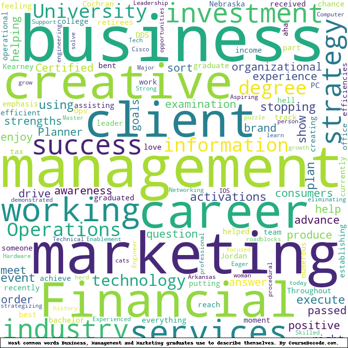 Here is a visual representation of the most common words seen in the "about" section of LinkedIn profiles who have a Bachelor degree in Business Management And Marketing. This may or may not be useful: