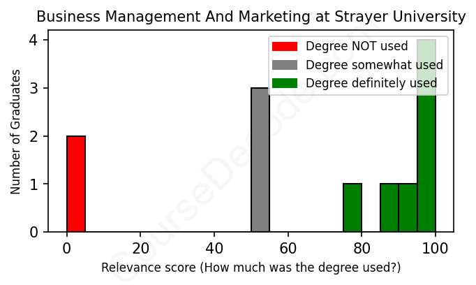 The verdict? Slightly below average. Overall, with an average relevance score of 66%, Business Management And Marketing graduates from Strayer University have a slightly lower likelihood (-1%) of finding work in this field compared to the average graduate across all fields: