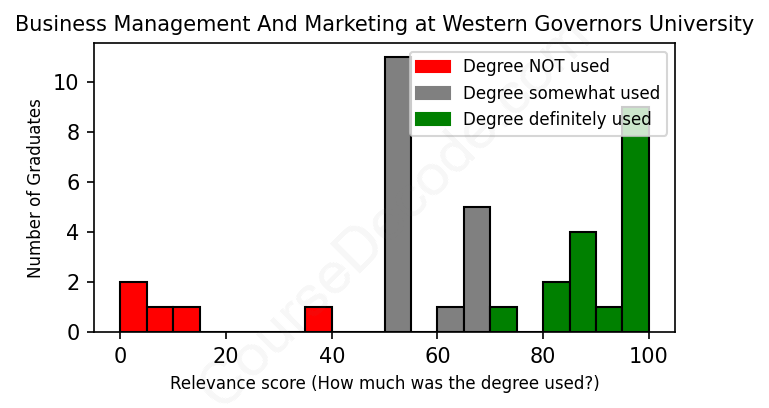 The verdict? Slightly below average. Overall, with an average relevance score of 65%, Business Management And Marketing graduates from Western Governors University have a slightly lower likelihood (-2%) of finding work in this field compared to the average graduate across all fields: