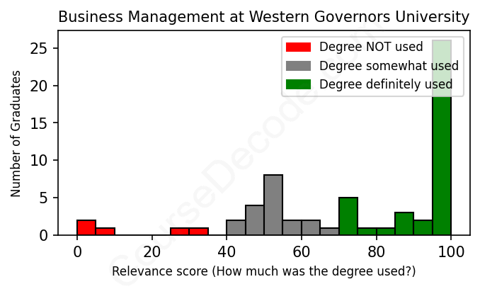 The verdict? Above average. Overall, with an average relevance score of 75%, Business Management graduates from Western Governors University have a higher likelihood (+8%) of finding work in this field compared to the average graduate across all fields: