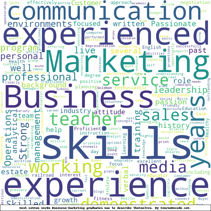 Here is a visual representation of the most common words seen in the "about" section of LinkedIn profiles who have a Bachelor degree in Business Marketing. This may or may not be useful: