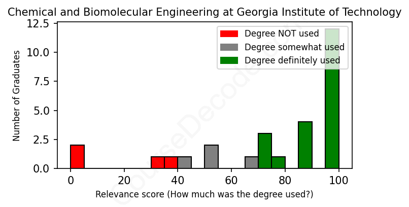 The verdict? Above average. Overall, with an average relevance score of 75%, Chemical and Biomolecular Engineering graduates from Georgia Institute of Technology have a higher likelihood (+8%) of finding work in this field compared to the average graduate across all fields: