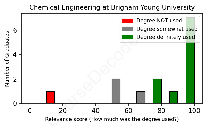 The verdict? Significantly above average. Overall, with an average relevance score of 79%, Chemical Engineering graduates from Brigham Young University have a much higher likelihood (+12%) of finding work in this field compared to the average graduate across all fields: